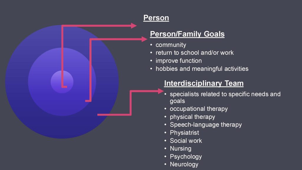 Interdisciplinary care is intervention where the person is at the center of care, their goals for improving function for improved quality of life are their focus, and the team is the supporting component working collaboratively to help the person achieve their goals.